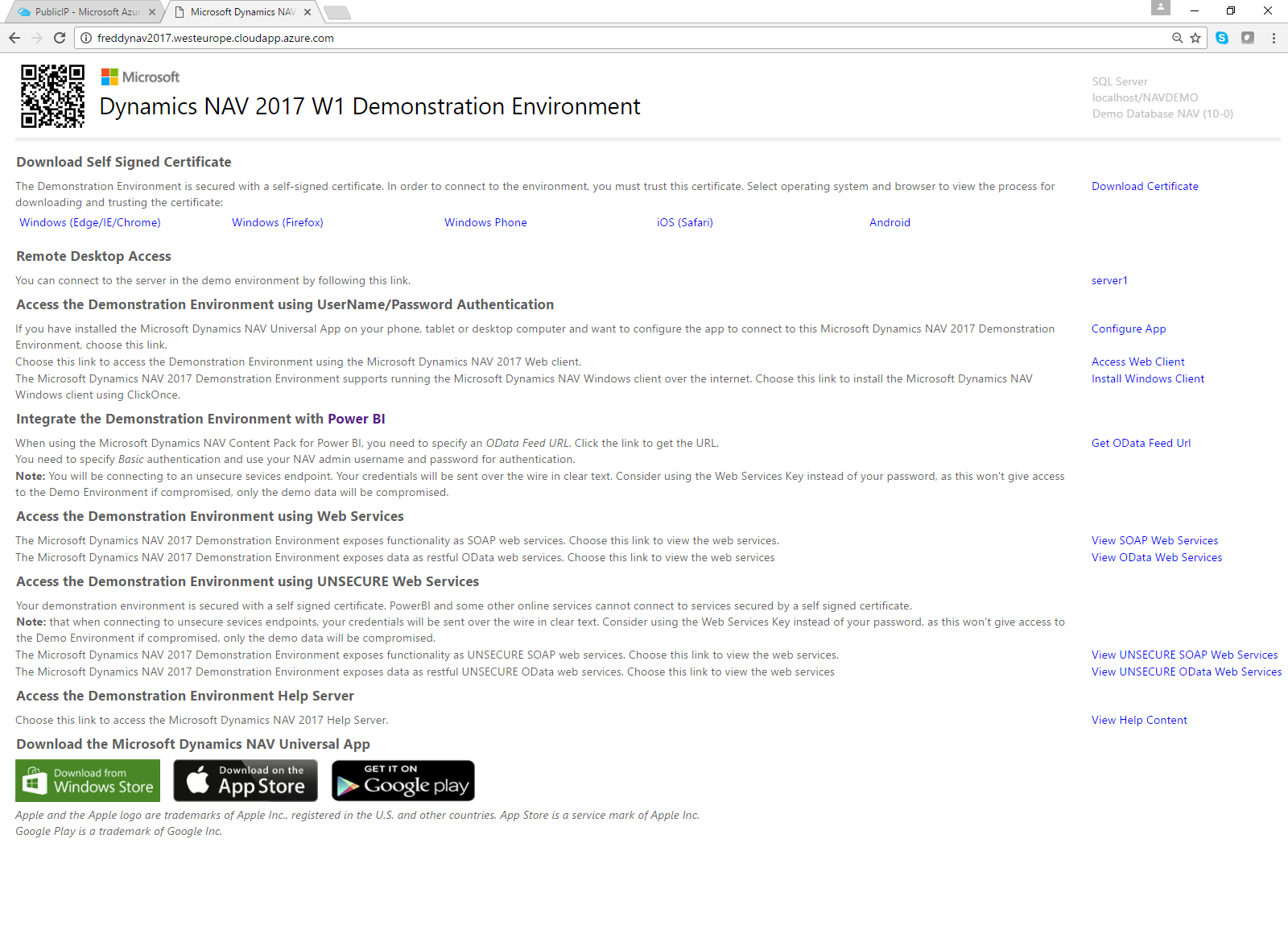 You will have deployed the latest Microsoft Dynamics NAV Demo Environment on Azure. The server should be up running and you can locate the URL for the Landing page at:
