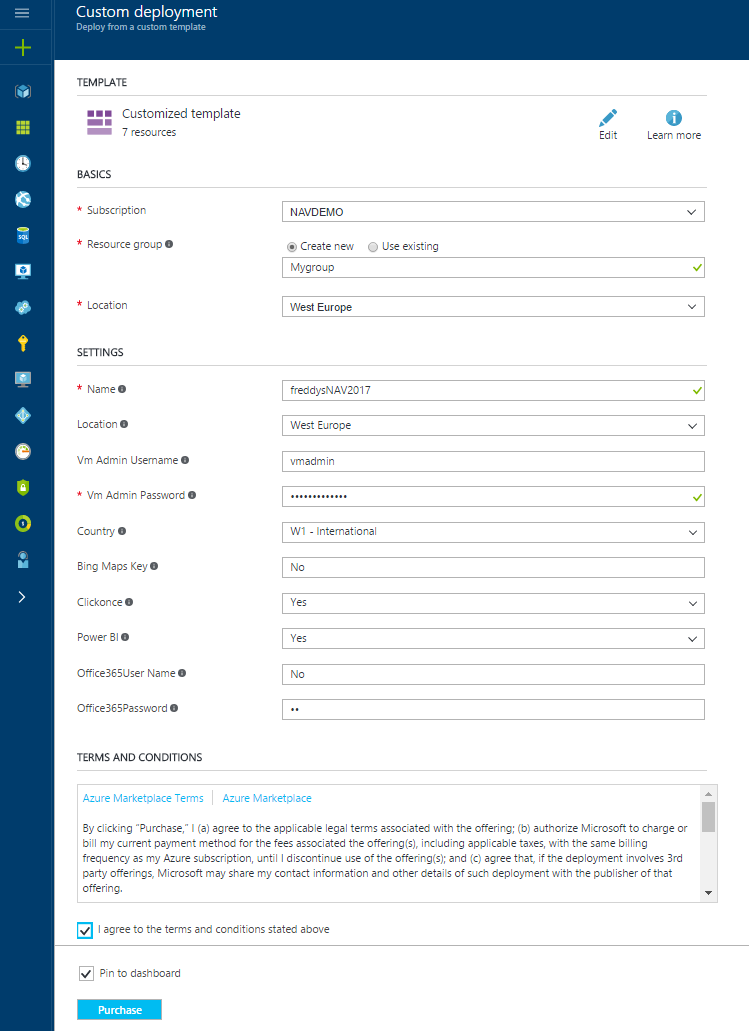 Login to your Azure Subscription. Select your subscription, resource group, location and name and a VM Admin Password. Leave the remaining fields as their defaults. Accept the terms, Pin to dashboard and select Purchase: