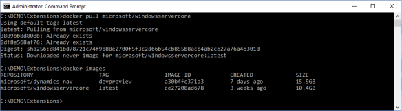 As you probably know, docker is using a layering technology, meaning that when I have this image I also have all the components for the images, on which this relies. I just haven’t combined the tags of these versions. If I perform a docker pull of microsoft/windowsservercore (which is one of the base images of the NAV on Docker image) you will see that Docker says that the layers already exists and now we have another image in the list: