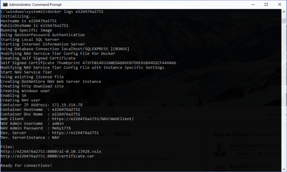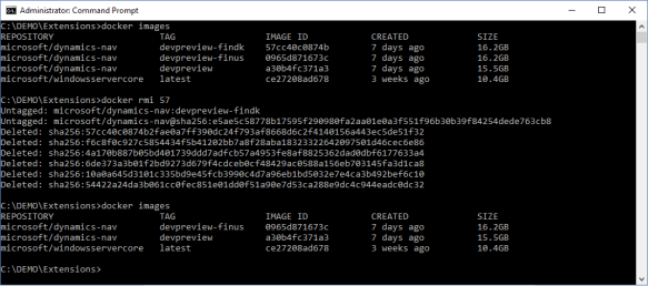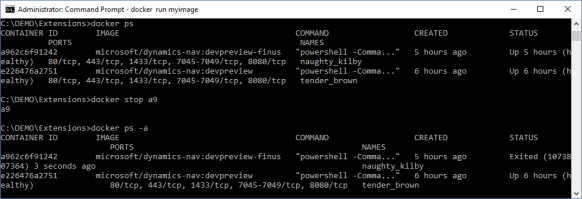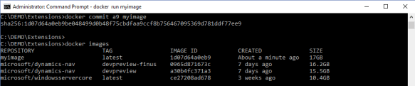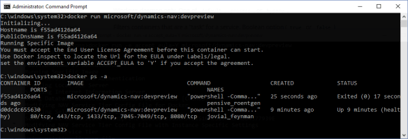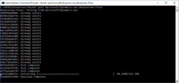 One important thing to notice is, that docker run automatically pulls the image if the image doesn’t exist. If the image already exists, the image is reused. That means that even if you remove a container and issue a new docker run microsoft/dynamics-nav:devpreview after the next update is available, it will NOT download the new version. You have to issue a docker pull specifically in order to pull a new version of an image.