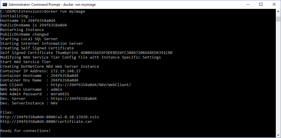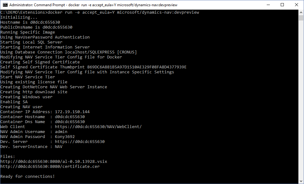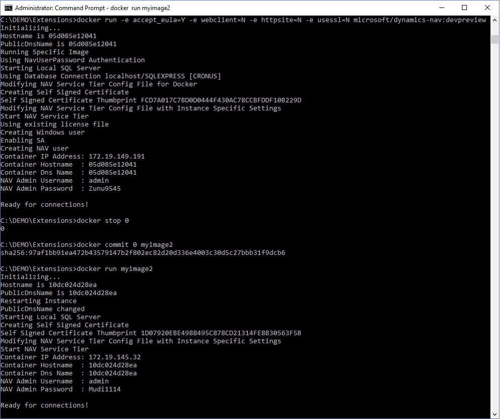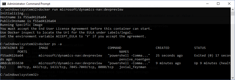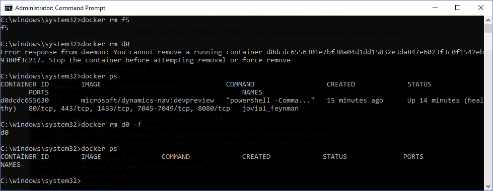 One important thing to notice is, that docker run automatically pulls the image if the image doesn’t exist. If the image already exists, the image is reused. That means that even if you remove a container and issue a new docker run microsoft/dynamics-nav:devpreview after the next update is available, it will NOT download the new version. You have to issue a docker pull specifically in order to pull a new version of an image.