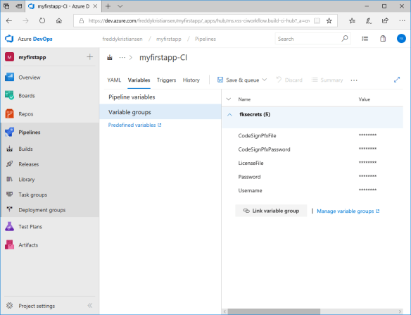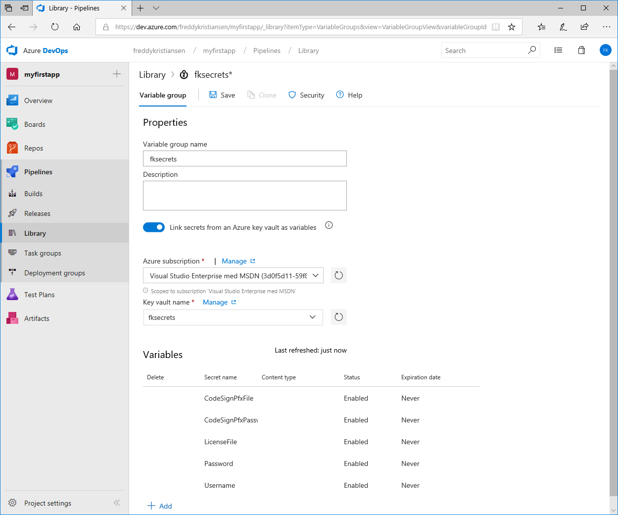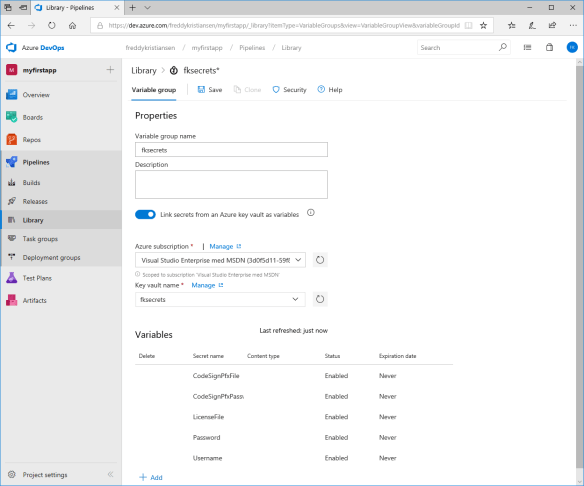 In part 1, we created an Azure KeyVault, with a number of secrets (password, license file etc.). We need these secrets in the build and fortunately, Azure DevOps has a nice way of getting to those.