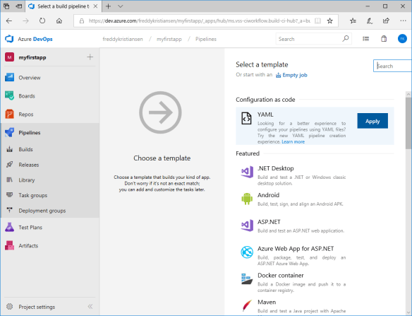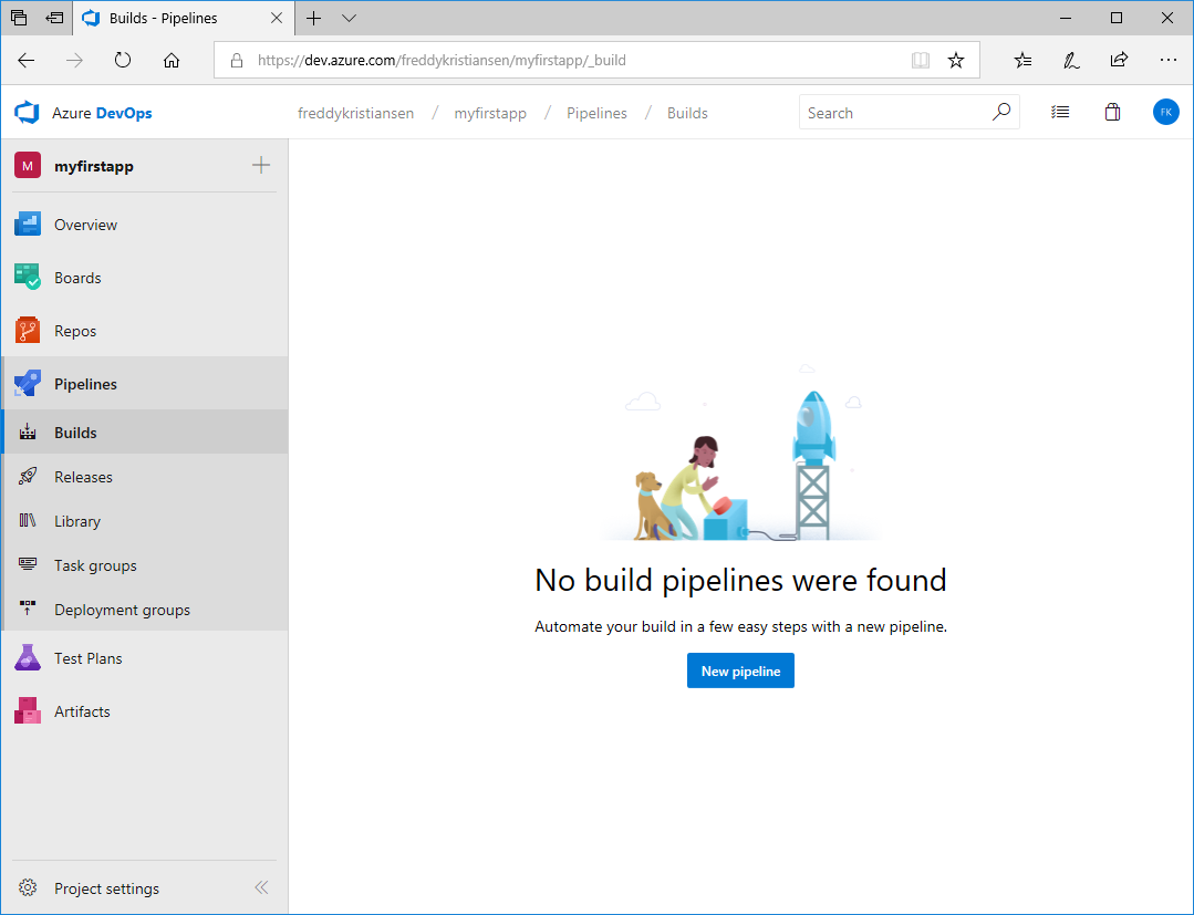 In Azure DevOps, under your Project, select Pipelines -> Builds. You will likely see that you have no build pipelines: