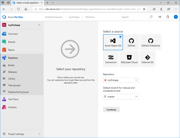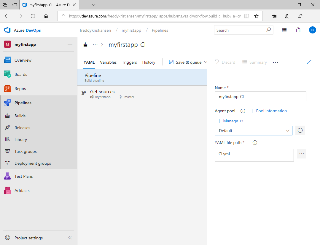 Select the Default Agent pool and select the CI.yml file (included in the repository)