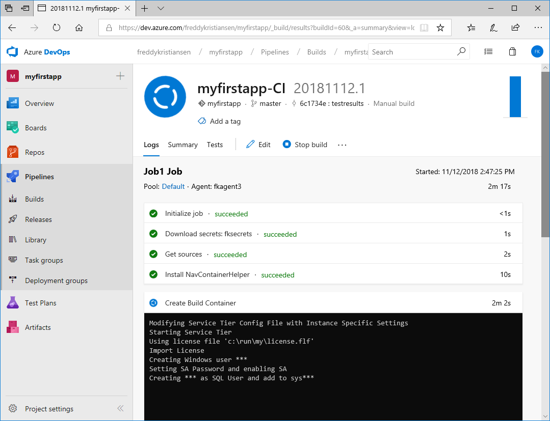 Note: The first time you run a build on the agent, it will take significantly longer because it needs to pull the Business Central Docker image.