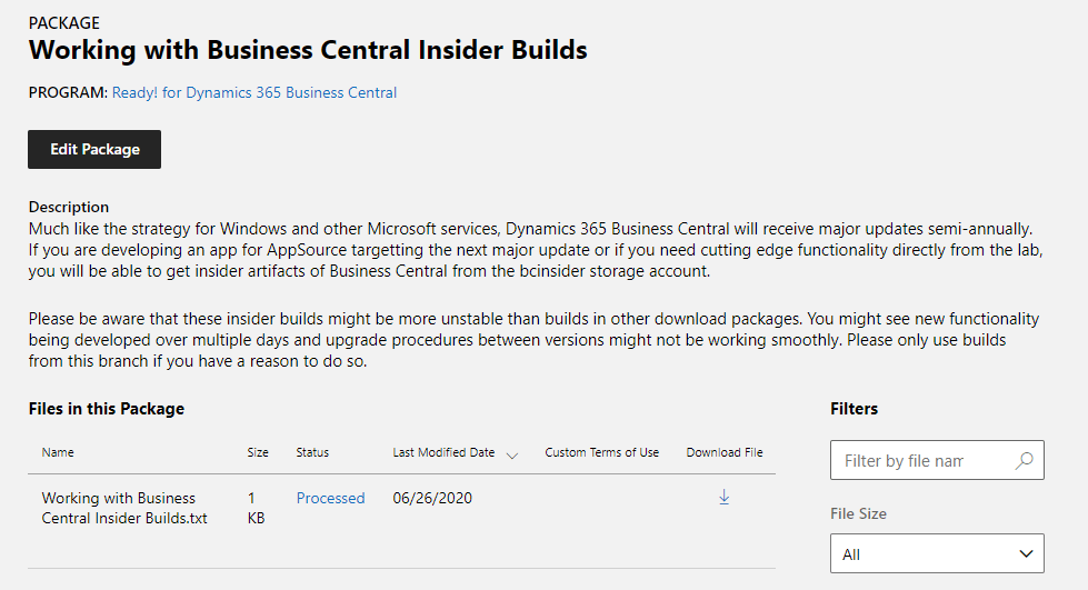 BTW – if you need a sasToken for insider builds it is available on http://aka.ms/collaborate – the actual package is here: https://partner.microsoft.com/en-us/dashboard/collaborate/packages/9387 (which you only can see if you have access to the Ready! for Dynamics 365 Business Central program). The package looks like this: