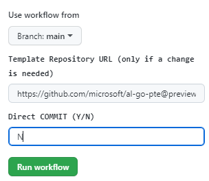 If you want to apply the preview version of AL-Go for GitHub, you can just enter the new URL and branch in the workflow parameters and press Run Workflow.